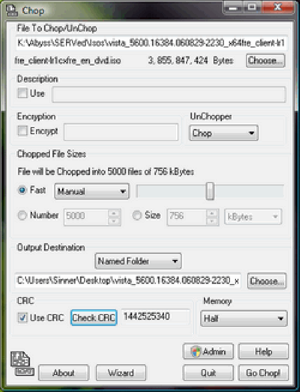 Chop - эта компактная программа для разделения больших файлов (в том числе больше 4 Гб) на байты для облегчения распределения. Это также полезно для разделения блока поток данных.