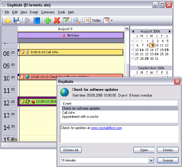 DayMate является универсальным интуитивно понятным обычному пользователю планировщиком дня. DayMate позволяет создавать и планировать напоминания, которые будут сигнализировать при помощи всплывающих сообщений или звука.