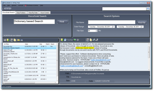 DocuGrab – удобный интрумент для поиска слов и фраз в документах PDF, MS Word или текстовых файлах. DocuGrab перенимает опыт Google, Yahoo, Bing для наиболее качественного поиска на вашем компьютере.