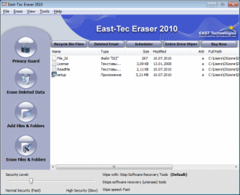 East-Tec Eraser – мощная программа, позволяющая осуществить полное и безвазвратное удаление данных. Благодаря East-Tec Eraser вы сможете быть уверены в том, что вашей конфиденциальной информацией не воспользуется кто-то в своих целях.