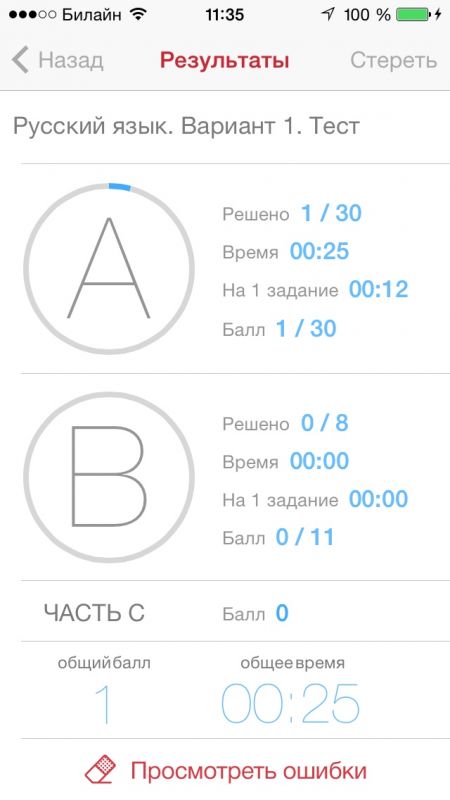 Приложение также сохраняет результаты всех попыток сдачи ЕГЭ через приложение, и в любой момент вы можете посмотреть какие ошибки вы допускали.