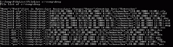 1. Список включает в себя название файла, размер, полный путь, расширение, название владельца, дату создания, дату изменения и последнего доступа