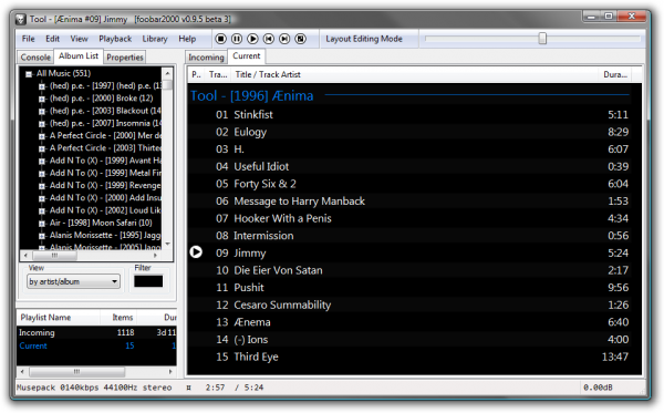 Foobar2000 - продвинутый аудиоплеер для Windows платформ. Поддерживает работу с форматами MP1, MP2, MP3, MP4, MPC, AAC, Ogg Vorbis, FLAC / Ogg FLAC, WavPack, WAV, AIFF, AU, SND, CDDA, WMA. Понимает текст в формате unicode. Умеет копировать музыку с CD-дисков.