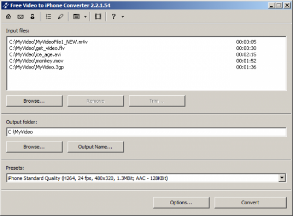 Free Video to iPhone Converter – отличный конвертер, позволяющий преобразовывать видео практически всех современных форматов в МР4 формат (H264, AAC), который является стандартом для устройств iPhone.