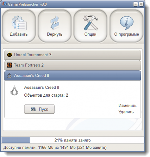 Game Prelauncher — это популярный комплексный оптимизатор системы Windows, созданный специально для игр. Превращает Windows в игровую платформу, в которой все ресурсы компьютера отдаются только игре. Для достижения данного эффекта, программа отключает большинство служб-сервисов (92% на Win 7) кроме критических, отключает все автозагружаемые программы, оболочку Explorer и сотни зарегистрированных вместе с ней библиотек, которые не используются для работы игры, звуковые темы и другие объекты. После игры, восстанавливает все обратно. Утилита имеет интуитивно понятный интерфейс с поддержкой русского языка.