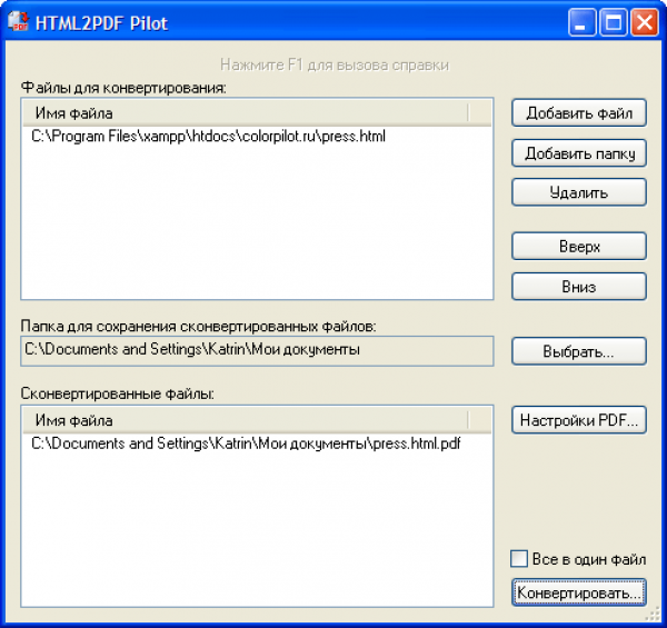 HTML2PDF Pilot конвертирует HTML файлы в PDF документ. Программа поддерживает управление из командной строки, пакетное
