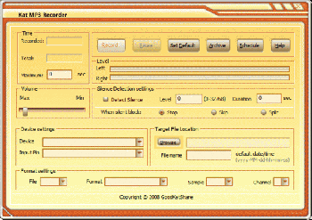 Kat MP3 Recorder – программа для записи любого звука проходящего через звуковую карту вашего персонального компьютера, другими словами, любой звук который вы сможете услышать, может быть записан.