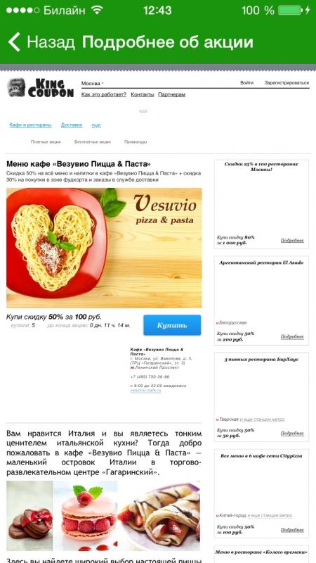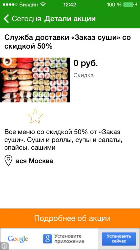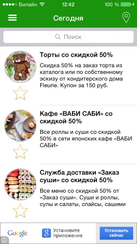 Купонатор - агрегатор всех скидок с популярных скидочных сайтов, таких как Групон, Биглион, КупиКупон и т.д. Все скидки представлены в одном приложении.