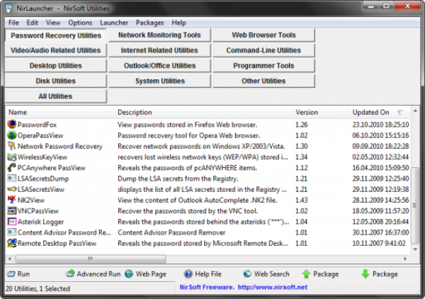 NirLauncher – это пакет утилит, состоящий из более ста наименований. NirLauncher включает в себя все, разработанные в течение последних лет, программы от Nir Sofer, которые объединены в удобную оболочку.