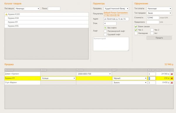 — Продажа товаров покупателю со склада и оформление заказов на товары.