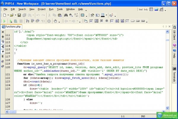 Один из лучших PHP-редакторов. Содержит огромное количество функций. Среди них есть совершенно особенная функция отладки PHP-скриптов, аналогов которой я не видел. Теперь процесс отладки скриптов стал такой же как в популярных интегрированных средах программирования (Delphi, Visual C++). Есть пошаговая отладка, вывод значений переменных. Программа включает в себя мини веб-сервер, а также дистрибутивы PHP5 и PHP4, руководства по PHP, Mysql. Более того, установив у себя на сервере специальный PHP-модуль, вы сможете удаленно отлаживать скрипты прямо на сервере! Есть встроенный ftp-клиент и клиент баз данных.
