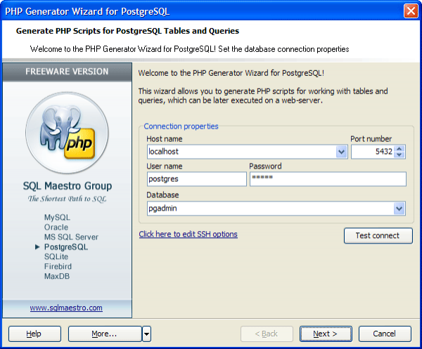 PostgreSQL PHP Generator – это мощный графический интерфейс для PostgreSQL который поможет вам генерировать высококачественные PostgreSQL PHP скрипты для выбранных таблиц.
