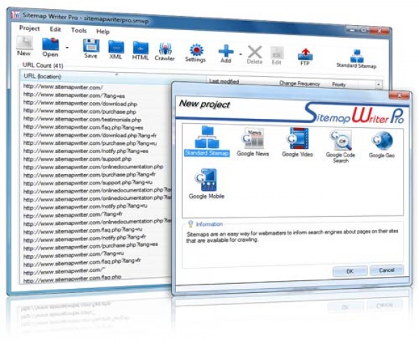 Sitemap Writer Pro представляет собой быструю, эффективную и простую в использовании программу для создания 6 типов сайтмап файлов (стандартный сайтмап, Google Image, Google News, Google Video, Google Code Search, Google Geo, Google Mobile). Программа дает возможность создавать сайтмап в формате XML и загрузить его на всех поисковых системах, которые поддерживают XML Sitemaps (Google, Yahoo, Ask.com, Bing (Live.com) и Moreover.com) для правильного индексирования вашего сайта. Sitemap Writer Pro является обязательным инструментом для каждого веб-мастера и владельца сайта, которые озабочены привлечением трафика с поисковых систем.