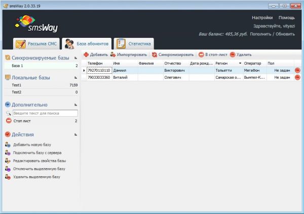Отличительной особенностью программы является возможность облачной синхронизации абонентских баз между программой и личным кабинетом. Вы можете хранить базу только локально на текущем компьютере, либо синхронизировать ее и иметь доступ с любого компьютера, зная логин и пароль.