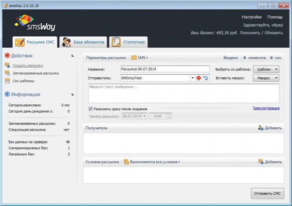 SMSWay – программа для рассылки СМС позволяет максимально комфортно и эффективно производить оповещение ваших клиентов по СМС о предстоящих акциях, мероприятиях или уведомлять о частных событиях с использованием индивидуальных данных конкретного клиента. Таким образом, можно оповещать о дате и времени записи на прием, настроить автоматическое поздравление с днем рождением или другими праздниками – при этом возможно личное обращение к каждому получателю по Имени/Отчеству.