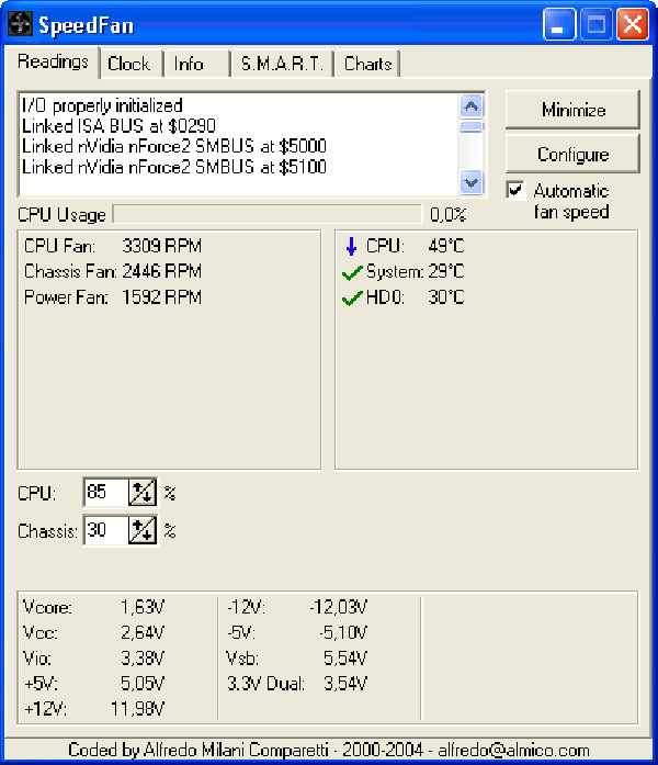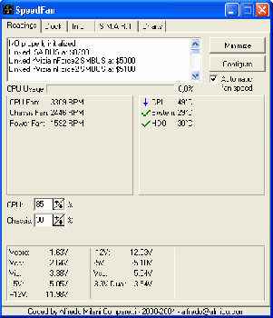 SpeedFan работает с большинством чипов и позволяет на лету изменять скорость вращения в зависимости от температуры внутри корпуса. Программа автоматически ведет статистику всех параметров и записывает их в log файл. И да, она абсолютно бесплатна.