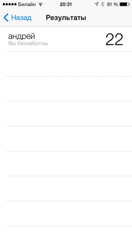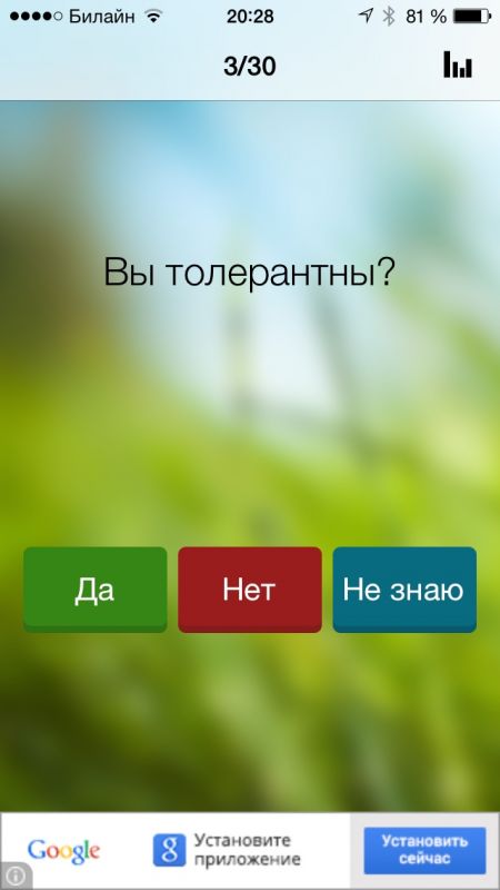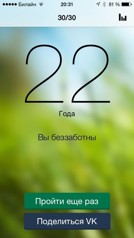 Интересное простое приложение поможет вам определить свой психологический возраст. Для этого необходимо ответить на 30 психологических вопросов, указать свое имя и реальный возраст. После выполнения этих нехитрых действий, приложение скажет вам насколько вы молоды в душе.