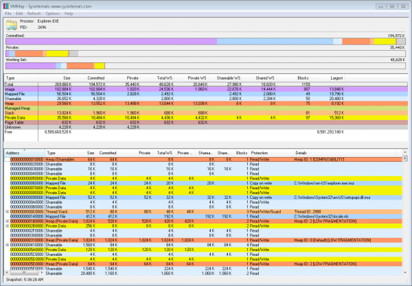 VMMap – небольшая утилита, позволяющая диагностировать неполадки на основе потребления системной памяти. С VMMap вы сможете получить визуальную карту распределения физической и виртуальной памяти.