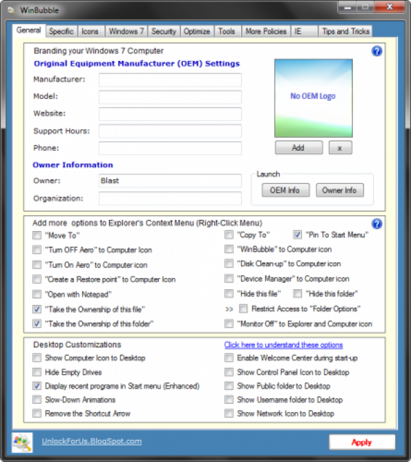 WinBubble – это удобная программа, позволяющая наторить некоторые аспекты операционных систем Windows Vista и Windows 7, которые не доступны обычным способом.