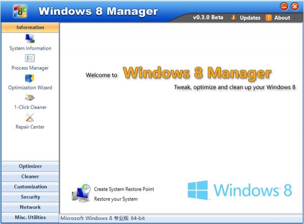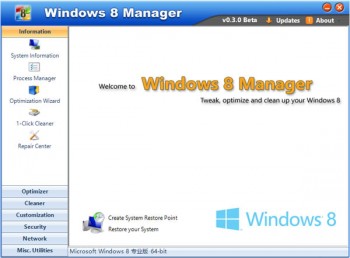 Windows 8 Manager - набор системных утилит, которые помогут вам оптимизировать, настроить, восстановить и очистить от лишних файлов Windows 8. Программа увеличит скорость работы системы, улучшит безопасность. Содержит ряд утилит, которые помогут узнать полную информацию о компьютере, оптимизировать работу системы, очистить винчестер от лишних файлов, тонко настроить Windows 8, поменять настройки безопасности, настроить сеть.